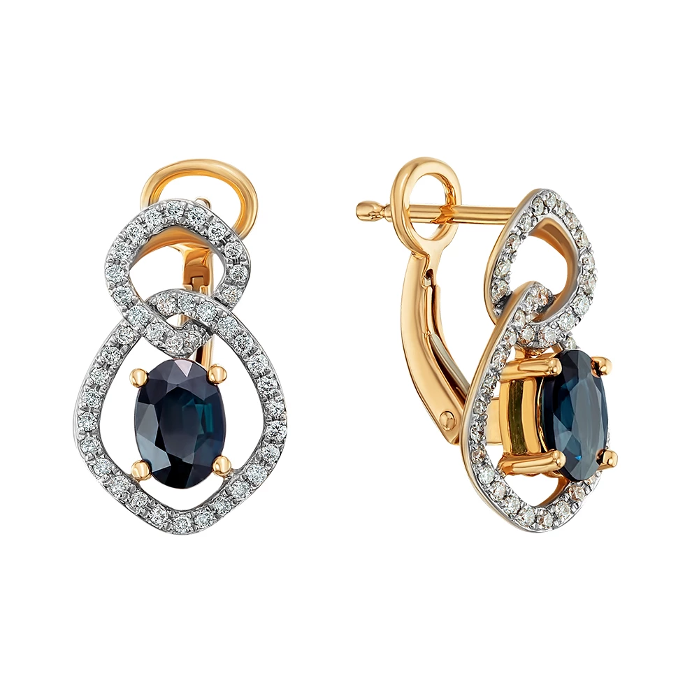 Серьги с сапфирами и бриллиантами в красном золоте 585 пробы. Серьги идеально мерцают на Вашем ушке. Украшение от которого не отвести взгляд. Выбирая украшение с такими благородными камнями, девушки окунают в мир классики и пополняют свою коллекцию достойными украшениями