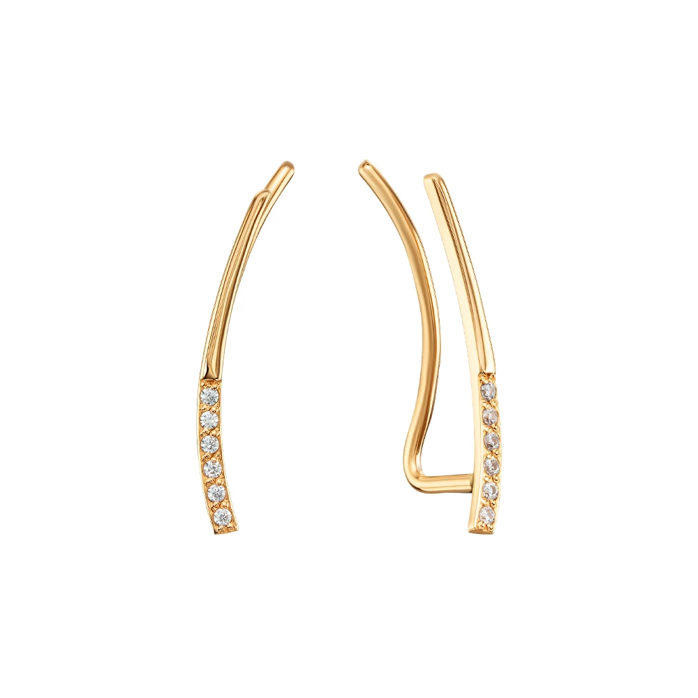 <p><strong>Размеры:</strong></p> <p>длина серьги - 23 мм</p> <p>ширина серьги - 2 мм</p> <h2><strong>Золотые серьги-клаймберы с фианитами.</strong></h2> <p>Блестящие серьги изготовлены из красного золота 585 пробы. Они имеют чрезвычайно нежный вид и идеально подойдут девушкам, которые любят ненавязчивые и лаконичные украшения. На каждой из сережек размещено шесть фианитов круглой огранки. Фиксацией на этой модели служит специальная петля сзади, которая крепко прижимает переднюю часть украшения к уху, надежно ее удерживая.&nbsp;</p> <p>Такие элегантные серьги имеют все шансы стать Вашим любимым украшением. Они легкие и удобные, и совсем не будут утяжелять ушки. Несмотря на простоту исполнения, с этой моделью можно создать множество оригинальных ежедневных образов.</p>