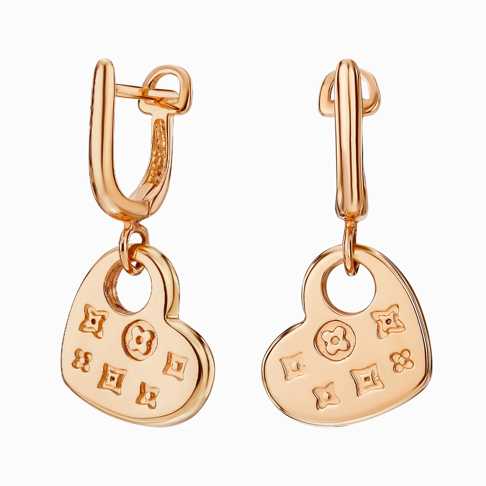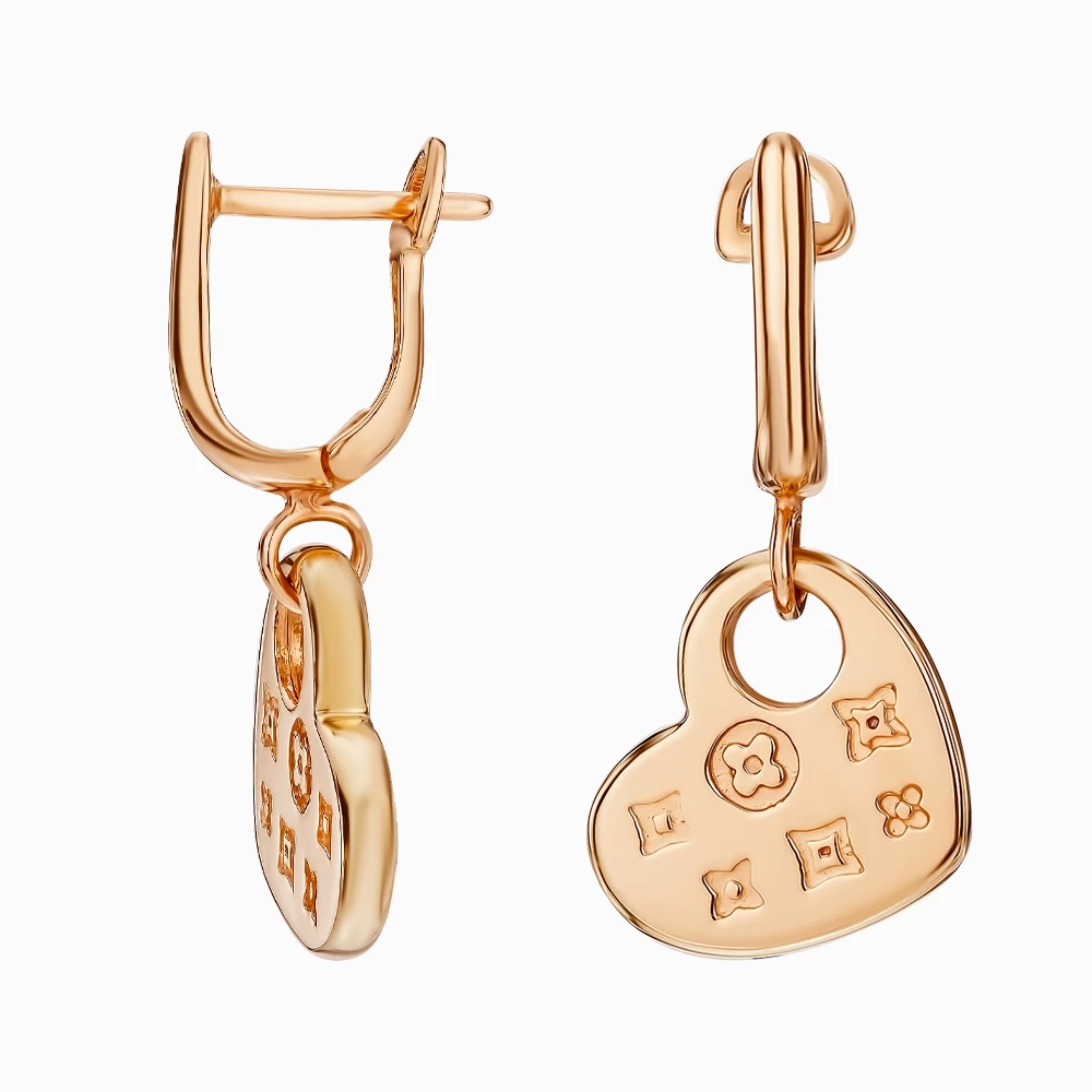 <p><strong>Размеры:</strong></p> <p>Длина с подвесной частью: 2,8 см</p> <p>Длина подвесной части: 1,5 см</p> <p>Ширина: 1,5 см</p> <p>Длина крючка: 1,1 см</p> <h2><strong>Золотые серьги-подвески</strong></h2> <p>Романтичные серьги-подвески из красного золота 585 пробы — это элегантное сочетание классики и нежности, созданное для настоящих ценителей утончённого дизайна. Их форма в виде сердца символизирует любовь, тепло и романтику, а тонкая гравировка на поверхности сердца с четырёхлистными цветами и звездами добавляет особого шарма. Использованная технология гравировки позволяет достичь прекрасного эффекта, который подчеркивает детализацию каждого элемента.</p>
