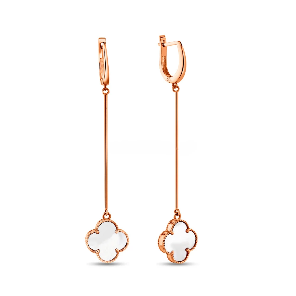 <p><strong>Размер:</strong></p> <p>общая длина серьги - 6,5 см</p> <p>ширина крючка - 1,1 мм</p> <p>длина крючка до защелки - 1,1 см</p> <h2><strong>Золотые серьги-подвески с перламутром.</strong></h2> <p>Это ювелирное украшение с перламутром из красного золота 585 пробы — беспроигрышный вариант для создания оригинального и необычного образа. </p> <p>Дизайн сережек выполнен в виде подвесных элементов с четырехлистным клевером, которые инкрустированы перламутром белого цвета. Считается, что такой минерал нужен каждой женщине, которая имеет хрупкую душевную натуру и склонна к стрессам и напряжению. Он наделит Вас уверенностью в себе, подарит успокоение. Серьги оснащены удобным и надежным английским замком.</p> <p>Эти невероятные серьги-подвески выгодно подчеркнут черты лица и изящество шеи своей обладательницы, а также придадут женственности любому образу. Предлагаем Вам выбрать к изделию комплект в виде кольца и браслета.</p>